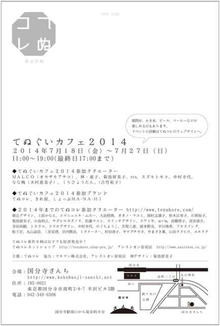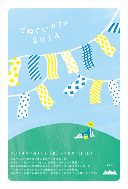 管理人さま てぬぐいのイベントを告知させてください。 よろしくお願いいたします。 てぬぐいカフェ2014 2014年7月18日(金)〜7月27日(日) 11:00〜19:00(最終日17:00まで) てぬぐいが手放せない暑い夏がやってきました。 今年の「てぬぐいカフェ」は、国分寺の山の上での開催です。 駅から徒歩8分の住宅街にあるシェアオフィス「国分寺さんち」に、 「てぬコレ」をはじめとする個性的なてぬぐいが大集合。 のんびりとお茶でも飲みながら、お気に入りのてぬぐいを探してください。 期間中、かき氷、ビール、