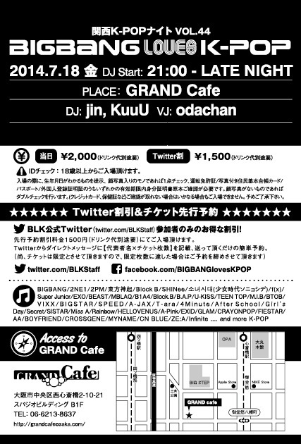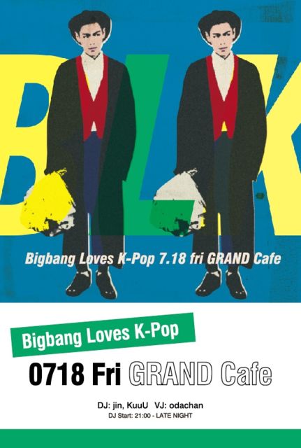 毎月第3金曜に引越しましたのでお間違いなく☆ 関西BIGBANG & 2NE1ペン・クラブイベント GRAND CAFEにて毎月第3金曜日開催!! 7月18日(金曜日)at GRAND CAFE(アメリカ村) 7月からスタート時間が22時から変更となります。 当日料金2000円(ドリンク代別途要) チケット先行予約:1500円(ドリンク代別途要) DJ jin, KuuU VJ odachan ◆◆関西KPOPイベント『BIGBANG loves K-POP』◆◆ ------------------------------------------------------------------------------------ BIGBANG以降のK-POPシーンを中心