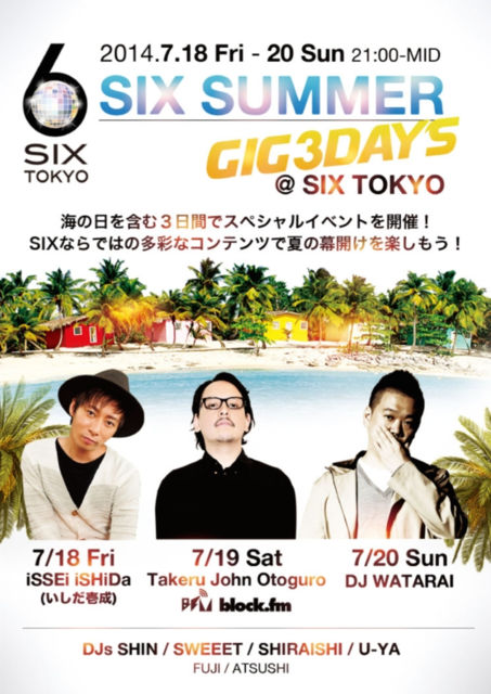 さぁ、いよいよ今夜7/18(金)開催!! SIXが夏に向けて送る第一弾イベント!! SIX SUMMER GIG 3DAYS 今日から開催です!! 今夜一日目は、毎週末述べ1000人以上を動員し続けている六本木随一のBIG PARTY『FOOL FOR FRIDAY』!! 毎週、豪華なGUESTと共に華やかなダンサーが舞う!! 土曜とは一味違うフェスティバル感を演出します! 豪華!!振る舞い酒サービスあり!! そして今回はGUESTになんと、、、 ★★★いしだ壱成★★★が登場!! 大爆発間違い無しです!! 六本木の新定番NEW PARTY『FOOL FOR FRIDAY』を是非 CHECK!! お見逃し