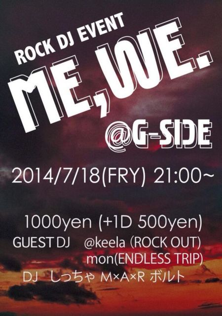 告知失礼します! 静岡県のロックキッズの皆様! 7/18(金)21:00から浜松のG-SIDEの3階でDJイベントやりますよ♪ 夏フェスシーズン前の予習や友達作りに! 京都大作戦の打上げ代わりに! 静岡でDJイベントを探していた! 邦ロックが好きだ! ライブが好きだ! フェスが好きだ! お酒が好きだ! 上記の様な方は是非☆ これからも浜松を盛り上げて行きたいんです! 遊びに来て一緒に地元シーンを盛上げましょう!! 皆さんの参加お待ちしてます(≧▽≦) 〜〜〜〜〜〜詳 細〜〜〜〜〜〜 ■浜松ロックDJイベントMe,We. 会場