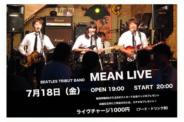 毎日うっとしいお天気が続きますが、いかがおすごしですか? ジメジメした天気を吹っ飛ばす『MEAN のBEATLES LIVE』 今月も行いま〜す♬ 第3金曜日の18日、19時オープンの20時スタートです。 お時間がございましたら是非遊びに来てくださいね〜 いつもの「えでぃさんの店」にて、お待ちしております。