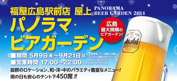 こんにちは! みなさまいかがお過ごしでしょうか? 今回は夏に向け、介護オフ会の常連さん『まっちゃん』が 企画する飲み会です☆夏といえばビールでしょ!!!とい うことで今回のオフ会はビアガーデンに決定しました☆ 今回、ボクは広告で協力させて頂きます☆今回も楽しい オフ会になればと思います!常連の方も初めての方も是非 ご参加ください!!! ■日時 ☆7月19日☆ 時間:18:00〜22:00 場所:福屋広島駅前店 パノラマビアガーデン 今年は屋根を400席分設置! 雨天でも楽しめます!! 新球場も見える