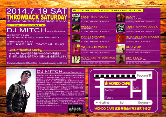 管理人様 告知失礼いたします。 早いもので明日から7月ですね♪ . 7月は奇数月☆ ってことで、第3土曜はMONDO CAFEにて . " THROWBACK SATURDAY " . が開催されますよ〜〜〜〜♪ HIPHOPやR&B、REGGAEの往年のHIT曲のみで構成されるパーティーです♪ . フライヤーの画像はあの伝説のグループ . " NWA " . をサンプリング〜〜〜〜^^ これもまたHIPHOP的な要素の一つです♪ . 裏面にはレコメンも載せてますので、チェックしてみてくださいね〜〜〜^^ そして、イベント専用のBLOGでもレコメンし