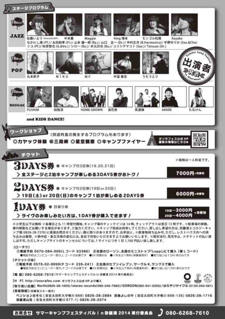 今年の夏はオソラで遊ぼう! 広島県の最高峰「恐羅漢山」で初のキャンプイベント開催! 会場内の特設ステージでは広島出身シンガーソングライター丸本莉子ちゃん他地元POPSやJAZZアーティストによるステージ、日本一のレゲエシンガーPUSHIMを筆頭に豪華アーティストによるレゲエステージもあります! また各種ワークショップや夜は星空観測会やキャンプファイヤーもやってます。 小さいお子さんから大人まで、みんなで楽しめるイベントです☆ 今年の夏の思い出作りは、オソラから始めませんか\(^o^)/ 当日券もございま
