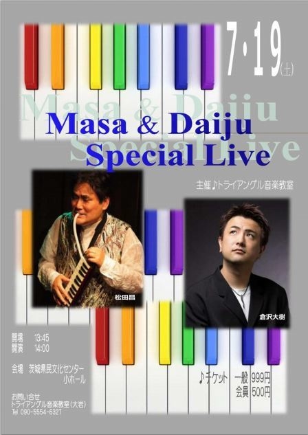 コンサート 2014年7月19日(土) 「SOLD OUTだそうですm(_ _)m」 Masa & Daiju Special Live 出演/松田昌(ピアニカ)倉沢大樹(ピアノ) 会場/茨城県立県民文化センター 小ホール(茨城県水戸市千波町東久保697) http://www.ibarakiken-bunkacenter.com/ 開場/13:45 開演/14:00 料金/一般:999円 会員:500円 お問い合わせ/トライアングル音楽教室(大岩)TEL:090-5554-6327 主催/トライアングル音楽教室