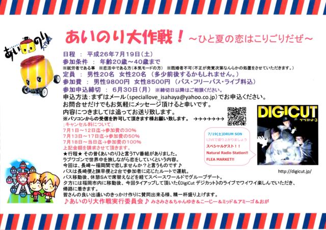 イベントスペースお借りします。 みなさん!こんにちは♪ 最幸に楽しんでますか? もう、夏ですね(*'▽') 夏の熱い日にこんな企画やっちゃいます( *´艸`) 【あいのり大作戦!!〜ひと夏の恋はこりごりだぜ〜】 バスでスペースワールドに行こう♪♪♪ 日程:平成26年7月19日(土) 参加条件:年齢20歳〜40歳まで ※就労者である事 ※恋活中である方(本気モードの方) ※既婚者不可(不正が発覚次第なんらかの処置をさせていただきます。) 定員:男性20名 女性20名 (多少前後するかもしれません。)