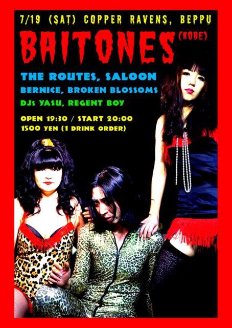 2014年7月19日(土曜日) COPPER RAVENS, 別府 バンド BAITONES The Routes Saloon Bernice Broken Blossoms DJ Yasu Regent Boy OPEN 19:30 START 20:00 Ticket 1500 (1drink order) BAITONES 1996年、神戸某所をヒッチハイク中のMIWAを通りかかった DAI が拾い、オルタネイティブ・ロック、ガレージ・カルチャーに傾倒していた2人はその場で意気投合、バンド結成のアイデアを語り合い、翌'97年結成。SURF INSTRUMENTAL/ ROCKABILLY/ GARAGE PUNK/PSYCHDELLIC ROCKに強く影響を受け、更にLO