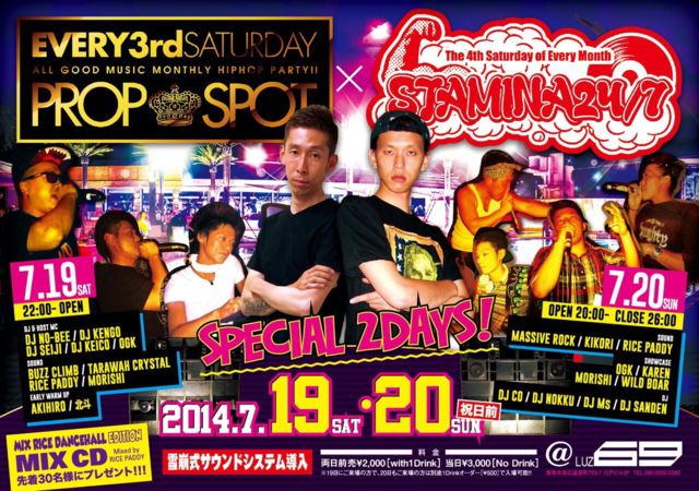 SPECIAL 2DAYS [PROPSPOT × STAMINA24/7] ■2014..7.19 sat ■@LUZ69 ■OPEN / START 22:00 DJ: NO-BEE, KENGO, SEIJI, KEICO HOST MC: OGK SOUND: BUZZ CLIMB, TARAWAH CRYSTAL, RICE PADDY, MORISHI EARLY WARM UP: AKIHIRO, 北斗 SOUND SYSTEM: 雪崩式 ADV: 2000(1D) DOR: 3000 ※19日にご来場の方で、20日もご来場の方は別途1Drinkオーダー[500]で入場可能!!