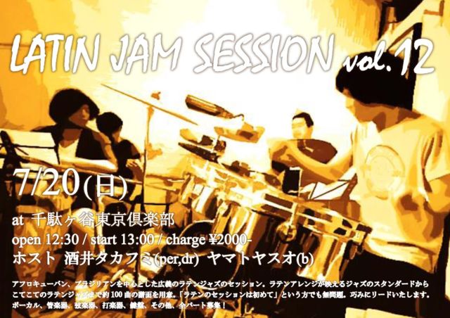 毎回ご好評頂いていますラテンジャムセッションのご案内です。今回はお昼です! 全パート歓迎・ご参加お 待ちしてます! 7月20日(日) LATIN JAM SESSION vol.12 @千駄ヶ谷 東京倶楽部 open 12:30 / session 13:00〜 charge ¥2000-(drink別) ※見学は半額 session host 酒井タカフミ(per,dr) ヤマトヤスオ(b) information アフロキューバン、ブラジリアンを中心とした広義のラテンジャズのセッション。 ラテンアレンジが映えるジャズのスタンダードからこてこてのラテンジャズまで約100曲の譜面を用意しまし た。 いわゆるデス
