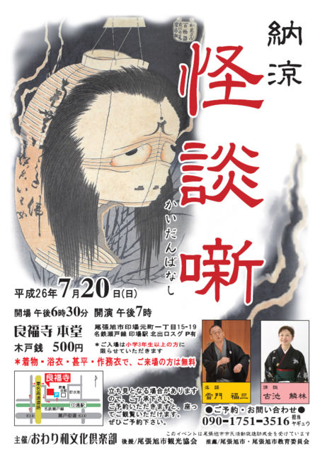 日 時:平成26年7月20日(日) 開 場:18:30 開 演:19:00 場 所:良福寺 (愛知県尾張旭市印場元町1丁目15−19) 名鉄瀬戸線 印場駅下車 すぐ 駐車場 有 入場料:500円(予約可・小学3年生以上) *お着物・浴衣・甚平・作務衣でご来場の方は、無料 尾張旭市の古刹・良福寺本堂をお借りして、怪談噺を開催します。 出演 落語:雷門 福三 講談:古池 鱗林 幽霊の登場する、落語と講談をお楽しみいただきます。 夏の夕べ、お