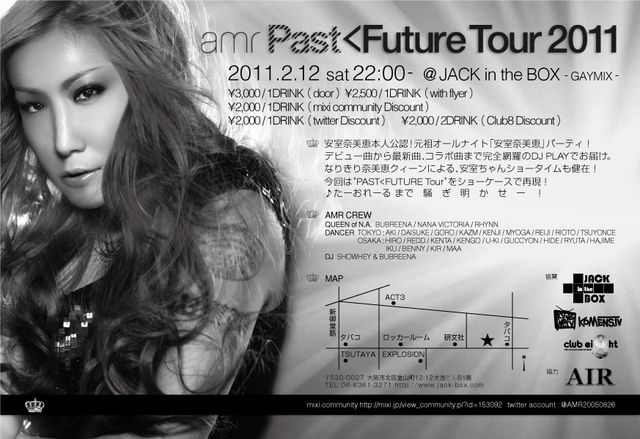 管理人様、コミュニティご参加の皆様、イベント宣伝失礼致します。 不適切な場合は、お手数ですが削除願います。 先日の新宿開催に続き、大阪開催が決定しました ゲイにご理解のある方でしたら、どなたでも参加大歓迎です! 新宿二丁目発、元祖オールナイト「安室奈美恵」パーティ! デビュー曲から最新曲、コラボ曲まで完全網羅のDJ PLAYでお届け。 なりきり奈美恵クィーンによる、安室ちゃんショータイムも健在! 次回は、PAST < FUTURE tour をショーケースで再現! たーお れーるまで 騒 ぎ 明 か せ ー