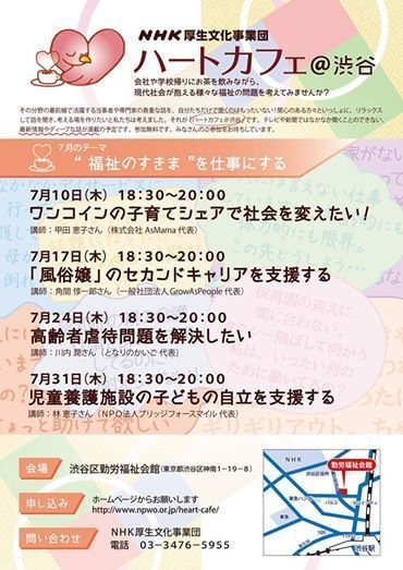 お茶を飲みながら講師の方のお話を聞く、 参加無料のミニ勉強会の情報です(^▽^) 主催:NHK厚生文化事業団 会場: 渋谷区勤労福祉会館 2階 第一会議室 (渋谷パルコパート1の向かい) 事前申込制です。 詳細・参加申し込みはこちらから。 http://www.npwo.or.jp/heart-cafe/2014/cafe02_03/ **************************************** 講師:川内 潤さん(となりのかいご 代表) **************************************** 現在、介護をしながら働いている人は全国で291万人。 介護と仕事の両立が難しく仕事を辞める