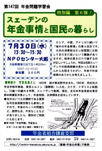 2014年7月30日1時半〜「NPOセンター大船」にて、スウェーデンの年金制度の学習会を行います。 講師:芝宮忠美(都本部年金相談室長) 主催:全日本年金者組合鎌倉支部 お問い合わせ:吉原=0467−45ー3957 http://nenkin-kamakura.sakura.ne.jp「鎌倉・年金仲間」で検索