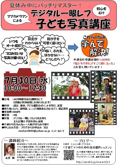 貴重なスペース失礼いたします。 お子様の撮影を得意とする「保育士カメラマン」の☆まい☆と申します。 イベントのお知らせです。 子連れ可☆初心者向け「一眼で子ども写真」レッスン いつもオート撮影 設定がわからない プロみたいな写真が撮りたい 我が子を可愛く撮りたい 暗い、ぶれる、ぼかせない・・・ これらのお悩み、一緒に学んで解決しましょう 日時:7月30日(水) 10:00〜12:30 場所:JR川崎駅付近の自宅にて(詳細は