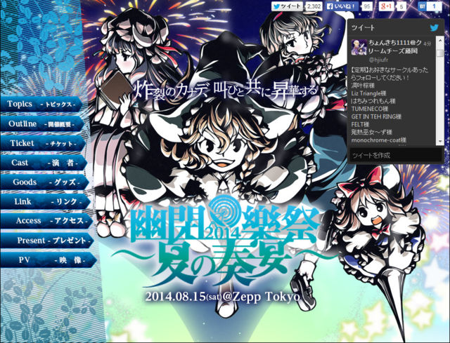 コミケの後に東方系サークルによるライブに行きませんか? 会場はZepp Tokyoでコミケ会場からも近いです(お台場観覧車の下) このようなライブイベントです 幽閉樂祭2014〜夏の奏宴〜 http://www.yuuhei-satellite.jp/live/2014summer/ PV1 PV2 豪華東方サークル陣のライブにより東方好きならもちろんですが、 東方良く分からないかも・・・・って人も楽しめると思います。 出演: 閉サテライト/A−One/豚乙女/DiGiTAL WiNG+Halozy/他 今回の企画は幽閉サテライト様と日本