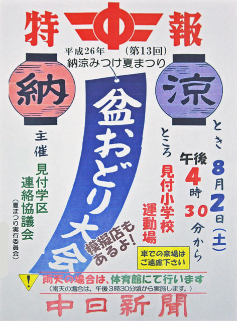 学区のさまさまな団体による手作りの夏祭りです。 どなたでもご参加いただけます。 どうぞおこしください。 ○日時 8月2日(土) 午後4時30分〜午後8時 ○場所 見付小学校運動場 ※雨天時は小学校体育館で開催 時間は午後3時30分〜午後6時30分に変更 飲食コーナー、ゲームコーナー、バザー、盆おどり、菓子まき(小学生以下)など 【主催】 見付学区連絡協議会 【共催】 区政協力委員会、民生委員会、保健委員会、見付消防団 防犯・交通安全協力会、スポーツ推進、日赤奉仕団、老人連合会 見付小PTA、見付おやじの会、見付こ