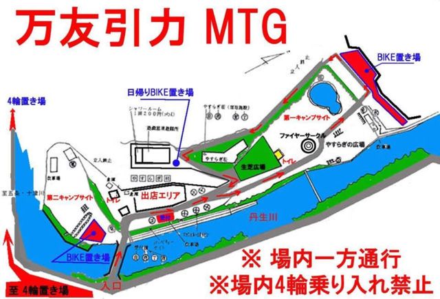 開催日程:2014年8月2日(土)〜8月3日(日)雨天決行 受付時間:2日(11:00〜21:00) 3日(7:00〜12:00) 開催場所:森林公園やすらぎ村(奈良県吉野郡下市町西山550) 参加費:2,000円 ペア(夫婦・カップル)バイカー特典あり ◆注意事項等◆ ・会場での受付後は、必ずスタッフの誘導、指示に従っていただきますように、ご協力をお願い致します。 ・自然の豊かなキャンプ場です、タバコのポイ捨て、極力ゴミを少なくし、分別にもご協力をお願い致します。 ・川への入水行為は