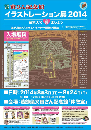 日程 2014年8月3日(日)〜8月24日(日) 時間 9:00〜17:00(8月19日(火)休館)(最終日は16:00まで) 入場無料 【期間中イベント】 1:似顔絵大会:8月3日(日)11:00〜16:30 2:緊急開催アカペラコンサート:8月9日(土)13:00〜16:00 3:ぬりえ教室:8月10日(日)12 : 00〜16 :30 4:漫画家のお仕事プチ見学会:8月17日(日)12 :00〜16 : 30 5:柴又プチツアー(寅さんぽ):8月24日(日)(最終日)11 : 30〜 ※イベントをはじめ、参加者一覧等諸々詳細は下記サイトにてご確認頂けま