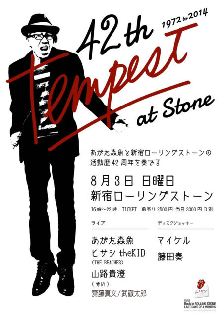 あがたさんと同じく今年で42周年になる、 新宿の老舗ロック箱ローリングストーンでのライブです! 絶賛予約承り中〜。 ◆2014年8月3日(日) 「42th Tempest at STONE」 〜あがた森魚と新宿ローリングストーンの活動歴42周年を奏でる〜 at 新宿・ローリングストーン (新宿区新宿5-4-1 QフラットビルB1靖国通り沿い、元厚生年金会館手前) LIVE:あがた森魚、ヒサシtheKID、 齋藤真文/武徹太郎、山路貴澄 DJ:マイケル、藤田奏 FOOD:mamma 16:00〜22:00 予約 2,500円 当日 3,000円(+1 drinkオーダー) 予約メール rockin_rollingstone@