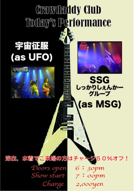 8/9 本日のライブ 「宇宙征服 & しっかりしぇんか〜グループ ライブ」 OPEN 18:30 START 19:00 CHARGE 2000円 浴衣、水着でご来場の方はチャージ50%オフ!