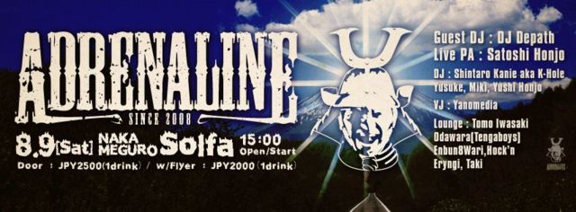 ADRENALINE SUMMER 2014 @ 中目黒Solfa 8/9(Sat) 15:00 Open/Start Door : 2500円(ワンドリンク付) w/Flyer : 2000円(ワンドリンク付) Guest DJ DJ Depath Live PA : Satoshi Honjo DJ Shintaro Kanie aka K-Hole, Yusuke, Miki, Yushi Honjo VJ Yanomedia Lounge Tomo Iwasaki, Odawara(Tengaboys),Enbun8Wari,Hockn, Eryngi, Taki 夏だ、海だ、シュランツda!!!!!!!! 今回はゲストDJに日本のマキナゴッドファーザー DJ Depathを迎え、アドレナリンハードサマーバージョンを爆催!!!!!!!!! 初公開とな