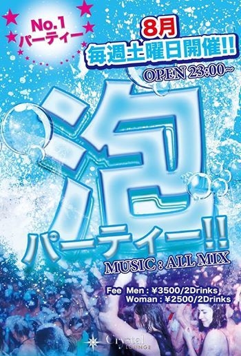 ☆ 2014,8,9(土)南青山 クリスタルラウンジ 『 泡PARTY 』!!!! ☆ ■エントランスにてDJ SHINTAROのゲストで女性¥1,000/Free Drink!!!(通常¥2,500/2D) 男性もディスカウントになります。 ■2:00より先着56名様シャンパンタワー、振る舞い有り ■23:00~midnight ■メインフロア(泡PARTY)、ラウンジフロア(ソファー席)行き来自由 ■ALL MIX PARTY!!!(TOP40/EDM/HIP HOP/R&B HOUSE andmore) https://www.facebook.com/aoyama.crystallounge/photos_albums