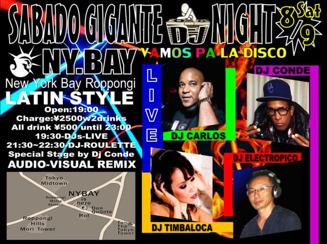 8/9(土) 19:00〜 @六本木NY BAY 【Sábado Gigante DJ Roulette】 \2,500(W2drinks) all drink \500- 今、ラテンイベントで人気の4人のDJによるDJイベントを開催します! レッスン、ダンスパフォーマンスなし! 早い時間からノンストップで踊れます! 最新の音楽から往年のあの曲まで! 個性的なDJ達の選曲をお楽しみ下さい!! エントランスは 2,500円で2ドリンク付! ドリンクは23:00までall 500円です! どんどん踊って飲んで楽しんで下さい! 大きなソファも沢山あるので、くつろぐことも出来ます! 1st stage(19:3