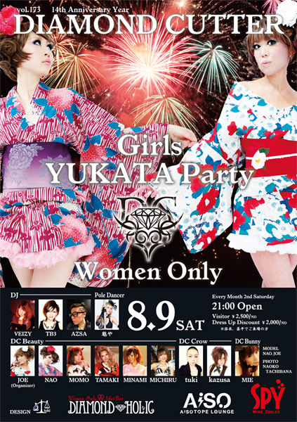 DIAMOND CUTTERはTV、雑誌など多くのメディアに取り上げられた話題の♀♀Girls Partyです いよいよ夏本番 8月のDCはYUKATA Partyで女だらけの夏祭り ダンスフロアを盛り上げる浴衣美人ダンサーにTIPを挟めばドキドキ急接近OK さらにSexy ポールダンスなど、一晩中女の子だけのアゲな企画が目白押し 会場は広くてオシャレな新宿2丁目AiSOTOPE LOUNGE ゆったり座れるオトナのVIP Roomはお一人様チャージ¥1,000で一晩中出入り自由 真夏のダンスフロアは美味しいお酒とHapp
