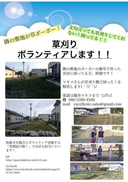 湊町は津波の影響をまともに受け、自分の敷地の周りで建物が流されて、そこに草が茫々に生えて、害虫が発生して窓も開けられない方がいらっしゃいます。 市役所に相談しても取り合ってもらえずに困っている方とも実際お話しました。 そこで、一人でも多く困った方のお手伝いをさせていただこうと積極的に活動しようと思っております。 イベント活動と並行して草刈りボランティアも募集しておりますので、週末マキコと一緒にできる方、ご連絡お待ちしております。 (マキコより) 8月は毎週土曜日に 草刈りボランティア活動をします ●8月2日