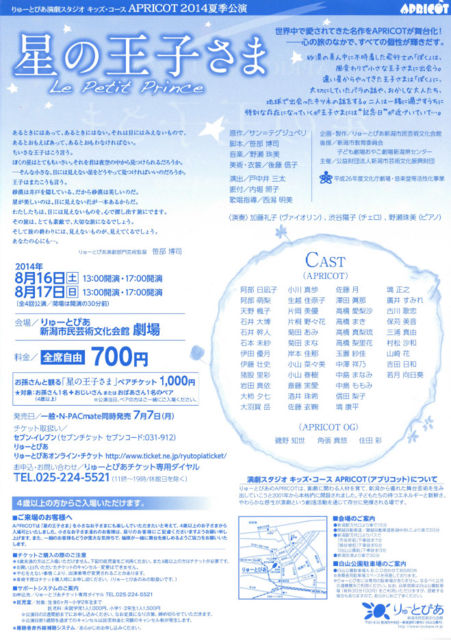 劇団アプリコット 今年の夏は「星の王子さま」 新潟市中央区の市民芸術文化会館「りゅーとぴあ」を拠点に活動する子ども劇団「APRICOT(アプリコット)」が16、17日、同会館で恒例の夏季公演を行う。演目は世界的ベストセラーの「星の王子さま」。今年は小さな子どもにも楽しんでもらおうと、これまで小学生以上としていた入場制限を4歳に引き下げた。 アプリコットは2001年に設立され、小学4年生から高校3年生まで50人が所属。「誰が見ても楽しめる演劇」を目標に掲げており、本格派の演技で知られる。 舞台装置