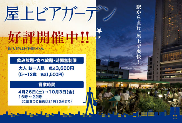 ビアガーデンの季節がやってきました(^^)/ 駅から直行!!屋上で爽快! のキャッチコピーのようにグビッと飲んでプハ〜ッ(≧∀≦)と盛り上がりませんか? アルコールが苦手な方はソフトドリンクで乾杯(^-^)人(^-^)しましょう。 名鉄百貨店屋上ビアガーデンは時間制限がなく 早く飲みたい人、早く集合できる人、お仕事終わりで合流出来る人、も時間を気にすることなく楽しむことができます。 【料金】大人\3600(税込) 子ども(5〜12才)\1500(税込) 食べ放題 飲み放題。時間無制限。 時間制限がありませんのでゆっくり飲んでたっぷり食