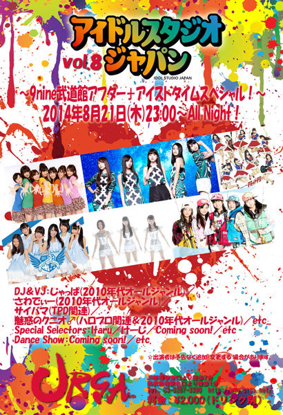 2010年代活躍中のアイドル楽曲をコンセプトに繰り広げるDJパーティー、 興奮度満載のスペシャル企画を織り込んで実現致します! “アイドルスタジオジャパンVol.8” 〜9nine武道館アフター+アイストタイムスペシャル!〜 日時:2014年8月21日(木)23:00〜All Night! 会場:新宿URGA 03-5287-3390 住所:新宿区歌舞伎町2-42-16第二大滝ビルB1 http://www.urga.net/ 料金:当日 ¥2000 (1ドリンク別途) DJ&VJ:じゃっぱ(2010年代オールジャンル)/ さわでぃー(2010年代オールジャンル)/ サイバマ(TPD関連)/魅惑のクニオ♂