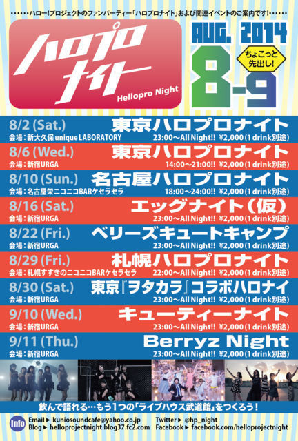 多彩な展開を見せるベリキュー関連が更によくわかる夏の夜、 是非ともお誘い合わせの上お付き合い頂けますと感激です! “ベリーズキュートキャンプ ver.43” 〜9.10-11武道館に向けてJUMP!ボンバー!〜 日時:2014年8月22日(金)23:00〜All Night!! 会場:新宿URGA 03-5287-3390 住所:新宿区歌舞伎町2-42-16 第二大滝ビルB1F http://www.urga.net/ 料金:当日2000円(1ドリンク別) DJ&VJ:おくちゃん/クニオ etc ベリー隊長:貴族 ☆出演者は予告なく追加・変更する場合があります。 【ベリーズキュートキャ