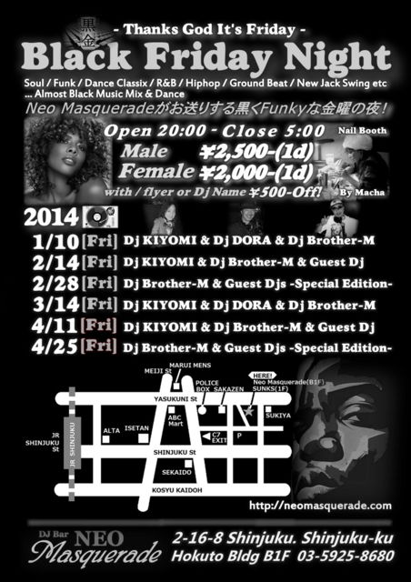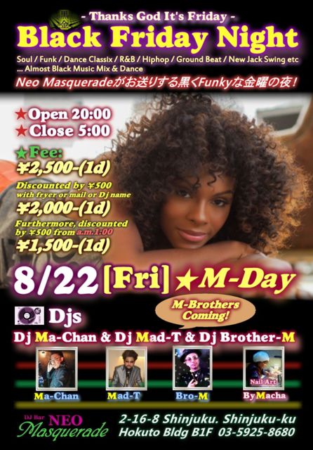 ____________ 8/22(Fri) 黒 金 Information ______________ ★いつもご来店ありがとぅございます☆ 8月4週の黒金はいつもとちょっと違う面子、Dj Ma-Chan、Dj Mad-Tを迎え、Dj Brother-Mと3人でお贈り致します! ★いつものようにSoul、FunkはもちろんR&B〜HIPHOPまで多様な選曲でお楽しみ頂けますョ! この夜もまた いろんなStyleのBlack MusicがPlayされるでしょう☆ BD Bashも承りますのでお気軽に ご連絡下さいませ^^b ★黒金の醍醐味・・・聴くもよし、踊るもよし、飲むも よし、ネールやるもよし、・・・という訳で、是非と