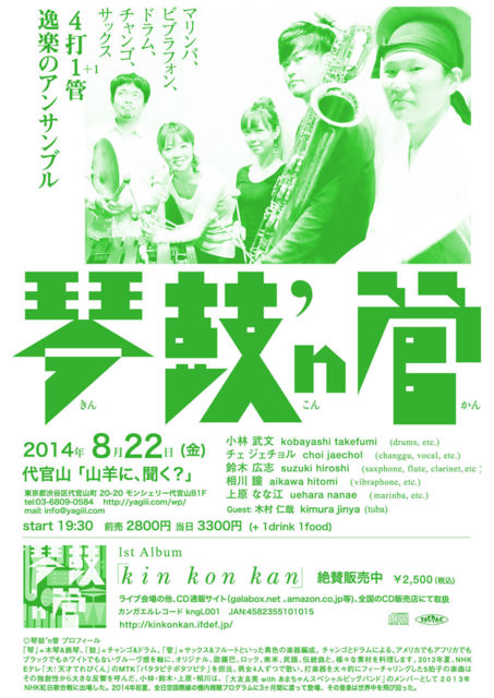 おお! 今週金曜日、オイラー小林さんのリーダーバンド 「琴鼓’n管」のワンマンライブ! 前回4/28以来であります! http://mixi.jp/view_event.pl?comm_id=5672761&id=76155432 -------------------------- ◆8月22日(金) 『琴鼓’n管』 kin kon kan 小林武文(drum) ☆彡 チェジェチョル(changgu,co,etc) 鈴木広志(sax,clarinet,recorder) 相川瞳(vibraphone) 上原なな江(marinba) http://kinkonkan.ifdef.jp/ guest 木村仁哉(tuba) 代官山「山羊に、聞く?」 http://yagiii.com/wp/ 東京都渋谷区代官山町 20-20