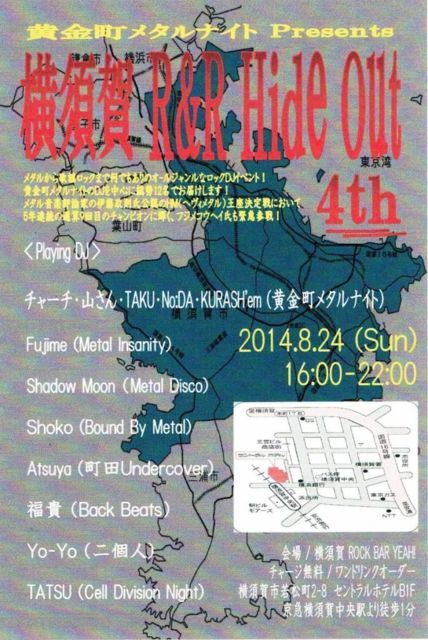 ´ÉÍý¿ÍÍÍ¡¢¹ðÃÎ¥¹¥Ú¡¼¥¹¤ò¤ª¼Ú¤ê¤·¤Þ¤¹¡£ ²£¿Ü²ì¤Î¥í¥Ã¥¯¥Ð¡¼YEAH!¤µ¤ó¤ÎDJ¥¤¥Ù¥ó¥È¡¢ ¤Þ¤¿¤ä¤ê¤Þ¤¹¡ª ROCK 'N' ROLL HIDEOUT Vol.4 Æü»þ¡§8·î24Æü(Æü¡Ë ¾ì½ê¡§ROCK BAR YEAH! (²£¿Ü²ìÃæ±û±Ø¡¢ÅÌÊâ2ʬ ¥»¥ó¥È¥é¥ë¥Û¥Æ¥ë£Â1£Æ¡Ë »þ´Ö¡§16:00¡Á22:00 ¥Î¡¼¥Á¥ã¡¼¥¸ DJ: ¥Á¥ã¡¼¥Á »³¤µ¤ó TAKU No:DA KURASH'em (°Ê¾å²«¶âÄ®METAL NIGHT¡Ë FUJIME¡ÊMetal Insanity¡Ë ShadowMoon¡ÊMetal Disco¡Ë Shoko ¡ÊBound By Metal¡Ë ATUYA¡ÊÄ®ÅÄUndercover¡Ë TATSU¡ÊCell Division Night¡Ë Ê¡µ®¡ÊBack beats!¡Ë
