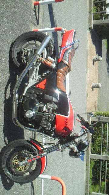 ・メーカー名 スズキ ・車名 GSX400インパルス ・年式 1994年 ・2st/4st 4st ・排気量 400(399)cc ・色 ヨシムラカラー(赤黒) ・自走 可 ・走行距離 約26000km ・車検/自賠責の有無 平成27年6月 ・事故歴 なし ・キズや不具合の有無 年式相当の錆、傷あり。 ・カスタム箇所や装備 ぴよぴよバイザー、ヘッドライトロングステイ、Z2ハンドル、六角グリップ、クリア砲弾ウインカー、メッキタンデムバー、フェンダーレス、フロントフォーク4月OH済、キャブ6月OH済、プラグ交換済6月、バッテリー新品6月、イグナイター新品6月。 ・希望価格