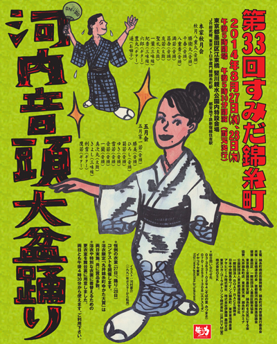 お待たせしました!! 第33回すみだ錦糸町河内音頭大盆踊り、今年もやりまっっせ〜 ■月日 8月27日(水) 28日(木) ■開場 午後5時 開演 午後5時30分 ■場所 墨田区江東橋 竪川親水公園特設会場 首都高速7号線下 ■交通 JR総武線/地下鉄半蔵門線 錦糸町駅下車徒歩5分 ■入場無料/両日雨天決行 ■出演 河内音頭五月会 VS 本家秋月会 本家秋月会 秋月八重丸(音頭) 勝衛丸(音頭) 千春(音頭) 八重春(音頭) 満若(音頭) 昌吾(音頭) 友若(太鼓) 聖札(太
