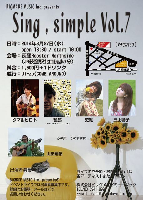 週末から台風などで天気が良くありませんでしたが、 今週からはお盆休みの方も多いと思います。 遠出される方など、くれぐれも事故なく お過ごしください! 8月は、「Heart to Heart」はお休みを頂き、 シンプルな中にも歌そのものの良さを発信していく 「Sing,simple」でのイベントライブを行います! 今回の初めて出演するアーティストがいたり、 新鮮な感じでお送りいたします! ----------------------------------------------- BIGMADE MUSIC Inc. presents 「Sing,simple」vol.7 日時:2014年8月27日(水)open18:30