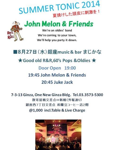 music & barまじかな(銀座西7丁目)で60'sな1日を♪ 19時 Door Open 19:45 John Melon & Friends 20:45 Juke Jack @1000 Table & Live Charge incl. 写真をクリックして下さい!