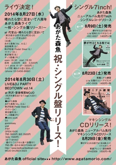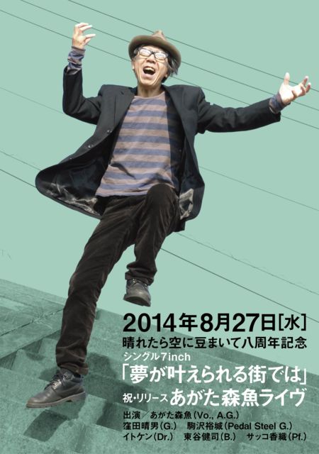 代官山のライヴハウス「晴れたら空に豆まいて」の八周年記念& シングル盤リリースライヴです。 こちらにコメントかメッセージ頂いても予約承ります〜! ◆2014年8月27日(水) 晴れたら空に豆まいて八周年 あがた森魚ライヴ 〜祝・シングル盤リリース!〜 at 代官山・晴れたら空に豆まいて (東京都渋谷区代官山町20-20 モンシェリー代官山B2) 出演:あがた森魚(Vo., A.G.)、窪田晴男(G.)、 駒沢裕城(Pedal Steel G.)、イトケン(Dr.)、東谷健司(B.)サッコ香織(Pf.) open 18:30 start 19:30 前売 3,000円 当日