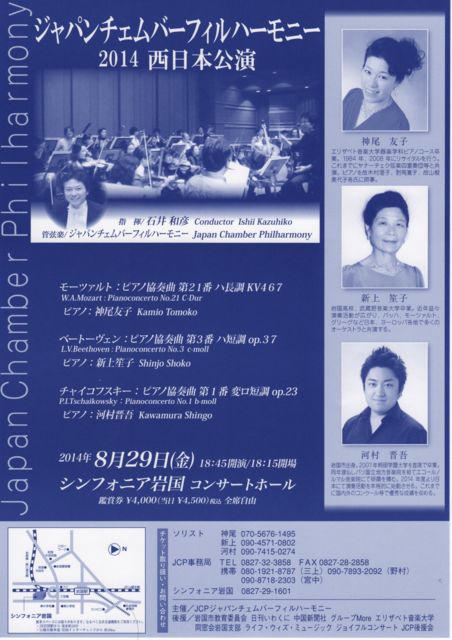 コンサートのお知らせです。 名曲・チャイコフスキーのピアノ協奏曲第1番を、来る8/29(金)シンフォニア岩国コンサートホールにて、ジャパンチェンバーフィルハーモニーと共演いたします。恥ずかしながら、人生で始めてオーケストラと共演します。この嬉しい機会を是非みなさんと分かち合えたらと思います。 チケットは、このページをご覧いただいた方には前売り正規料金4000円のところ、一般3500円、学生2000円にさせていただきます。 直接FBでメッセージをお送りください。 是非聴きにいらしてください!