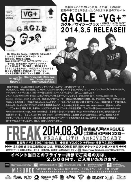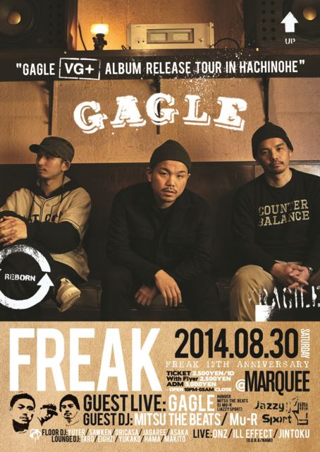 遂に来週末! GAGLEでは、2007年発売の3PEATリリースツアー@BAOBAB以来の来八! FREAKも12年の月日を重ね、沢山の音楽や仲間と出会いながら、 芯に持つものは絶えず変わらず伝えてきたつもり! その中にGAGLEという音楽を、同じ東北人として、老若男女問わず伝えたい。 特に八戸の若い子たちに。... 「VG+」はもちろん、過去の作品もチェックしてみてください! http://gagle-official.com/ http://jazzysport.com/2014/gagle さあ一緒に盛り上がろう! チケットに関して、いつでもメッセージお待ちしてます。 ドリン