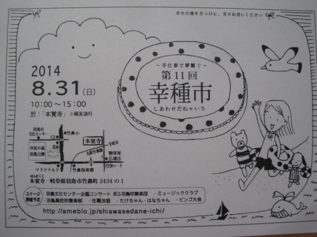 いつも ありがとうございます!!! おかげ様で、今回で11回目の幸種市(しあわせだねいち)です☆ http://ameblo.jp/shiawasedane-ichi/ 地元羽島市を盛り上げたい!という願いを込めて 今回も 皆さんのお力をかりて 元気いっぱい楽しい一日にしたいと思います☆ 是非、夏休み最後の思い出作りに、遊びにきてください★ ********************************************** 2014年8月31日(日)雨天時は本堂内で開催。 10時から15時まで 本覚寺さまにて開催。 (岐阜県羽島市竹鼻町2434-1) 30ブースほどの ハンド