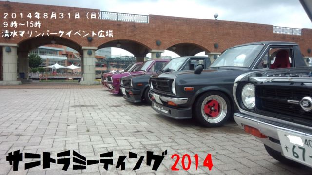 【日時】 8月31日(日)9時〜15時 【場所】 清水マリンパークイベント広場 (静岡県清水市) 【費用】 1000円程度(台数により多少増) 【参加可能車両】 サニトラ.サニー A型エンジン搭載車両 ※参加者の友人に限りギャラリー車コーナー準備 例年通りオフ会的なまったりイベントです 車両周りで収まる程度ならフリマOKです ショップの方などで商品販売を行いたい場合は連絡ください 後は良くあるミーティングマナー遵守でお願いします
