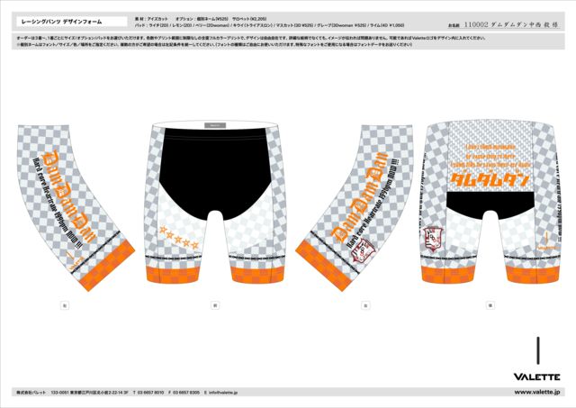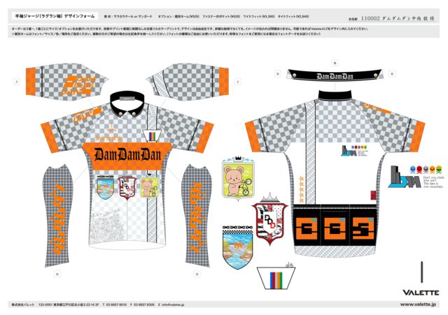 ジャージ製作メーカー バレット http://www.valette.jp/item/index.html 1)ジャージ \12800 http://www.valette.jp/item/item01.html サイズ メンズ XS / S / M / L / XL / XXL レディース Sw / Mw / Lw ファスナー付ポケット \500 ワイドフィット・セミワイドフィット \3200 セミタイトフィット・タイトフィット \2800 2)パンツ \11000 http://www.valette.jp/item/item03.html サイズ XS / S / M / L / XL / XXL サロペット \2100 パッド(以下から必ず選択してください) http://www.valette.