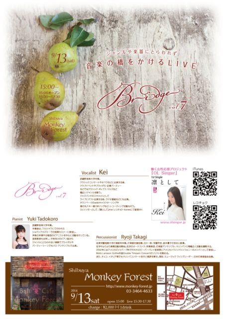 ÍÍ¡¹¤Ê¥¸¥ã¥ó¥ë¤È³Ú´ï¤Ç¡¢²»³Ú¤Î²Í¤±¶¶¤ò¡¦¡¦¡¦ Vocalist Kei¡¡¤È¡¡Pianist¡¡Yuki¤¬¤ªÆÏ¤±¤¹¤ë¡¢Bridge¥·¥ê¡¼¥º¤Î7²óÌÜ¢ö ²Æ¤Î½ª¤ï¤ê¤Î9·î13Æü¡¢º£²ó¤Ï¡¢¥Ñ¡¼¥«¥Ã¥·¥ç¥ó¤Î¹âÌÚÎɯ󤵤ó¤ò¤ª·Þ¤¨¤· ¥Ý¥Ã¥×¥¹¡¦¥¯¥é¥·¥Ã¥¯¡¦¥¸¥ã¥º¡¦²ÎÍØ¶Ê¤È¡¢¥ª¥ê¥¸¥Ê¥ë¶Ê¤ÎLIVE¤Ë¤Ê¤ê¤Þ¤¹¡ª ³§ÍͤΤª±Û¤·¤ò¤ªÂÔ¤Á¤·¤Æ¤ª¤ê¤Þ¤¹¢ö Æü»þ¡§2014/9/13(ÅÚÍËÆü)¡¡15:30¡¡START ¾ì½ê¡§¥â¥ó¥¡¼¥Õ¥©¥ì¥¹¥È http://www.monkey-forest.jp/ ÅìµþÅÔ½Âë¶èºùµÖÄ®10-8 03-3464-4633 Charge¡§2,000±ß¡Ü1drink