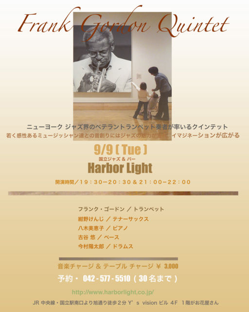 国立在住のニューヨークジャズ界のベテラントランペット奏者、 フランクゴードン率いるクインテットライブのお知らせです。 ハーバーライトでのライブは会を重ねてきましたが、 ふだん常連さんで予約がすぐいっぱいになってしまうので 国立の方にもぜひこのライブを知っていただきたいと お話されていたので、こちらでお知らせしました。 本場のジャズトランペットの大人の音色を国立のライブハウスで間近に♪ フランクが育ててきた若いリズム隊も会を重ね息もぴったりです。 音楽チャージ&テーブルチャージ ¥3000 お問い合わせ