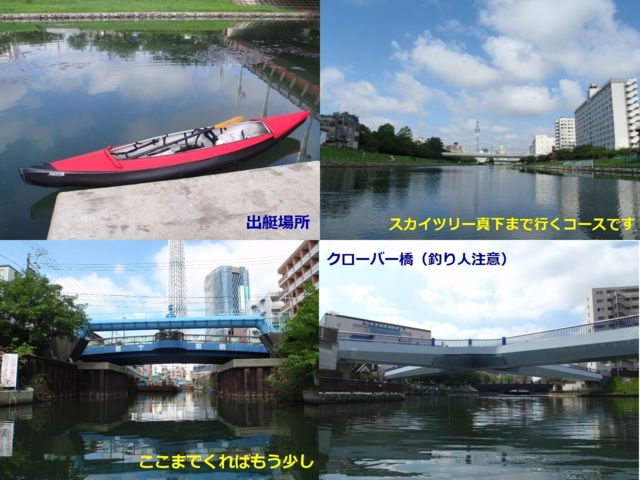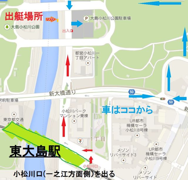 東京の運河をカヤックでクルーズ!東京スカイツリーの真下まで、漕ぎ進むとどんどん大きくなるスカイツリー!東京の街を一番低い所から眺めてみませんか? 出発場所は公衆トイレ・水場完備。 月日: 2014年09月21日(日) 荒天の場合は延期 集合場所: 東京都江戸川区小松川1丁目7 大島小松川公園駐車場 アクセス 都営地下鉄新宿線「東大島駅」(S16)徒歩5分 小松川口 出口から出てロータリー内のセブン-イレブンを右手に見ながら進むと旧中川にぶつかります。川を正面に右折して小松川さくらホール方面へ、川を左手に見ながら陸
