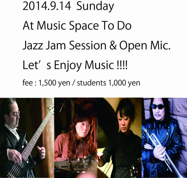 2014-9-14 Sunday start at 15:00 end at 18:00 Jazz Jam & Open Mic. at Music Space To Do 2014ǯ9·î14Æü¡¡ÆüÍËÆü¡¡15:00¡Á18:00 at Music Space To Do ÃæÄÅ ¡Ú¥Û¥¹¥È¡Û ¹ÔËÜÀ¶´î¡¡tp º´ÂíËã´õ¡¡pf ¥°¥ó¥¿¡¼¡¦¥¤¥·¥¤ b Ä»³ÀÍ¥±© ds ¡Ú»²²ÃÈñÍÑ¡Û °ìÈÌ¡¡1,500±ß ³ØÀ¸¡¡1,000±ß ¸«³Ø¡¡1,000±ß ¥Ü¡¼¥«¥ë¤ÎÊý¤Ï £²¶Ê¤Û¤É¥ê¥¯¥¨¥¹¥È¤·¤Æ¤¯¤À¤µ¤¤ Áª¶Ê¤Ï [The Handbook Of Jazz Standerd] (Ä̾Ρ¡¡ÖÀÄËÜ¡×¡Ë [¥¹¥¿¥ó¥À¡¼¥É¡¦¥¸¥ã¥º¤Î¤¹¤Ù¤Æ] [¥ê¥¢¥ë¡¦¥Ö¥Ã¥¯] [¹õËÜ] ¤«¤é¤ª´ê¤¤Ã×